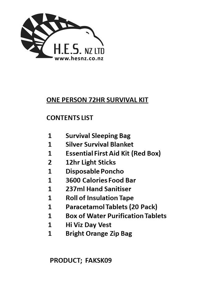 Contains food, First Aid, Shelter and light equipment. Compact and effective for one person for up to 72hrs