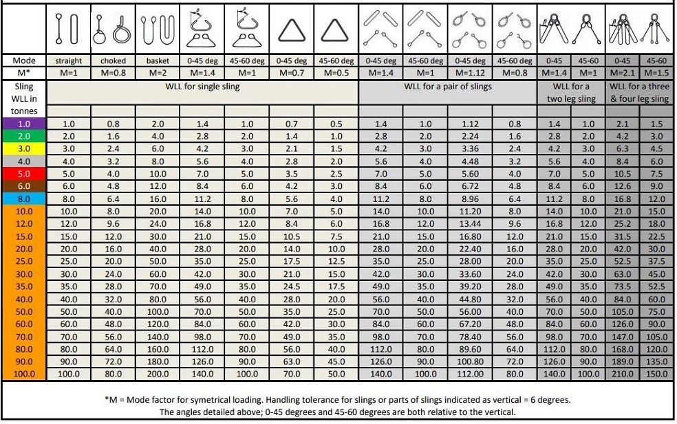 A 60 degree 2 leg sling example: If the weight of the load to be lifted is 20 tonnes and the angle between the legs of a two-legged sling is 60 degrees. This means that the load factor is 1.7 for the angle.